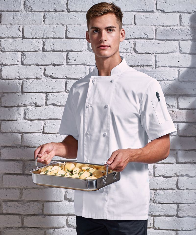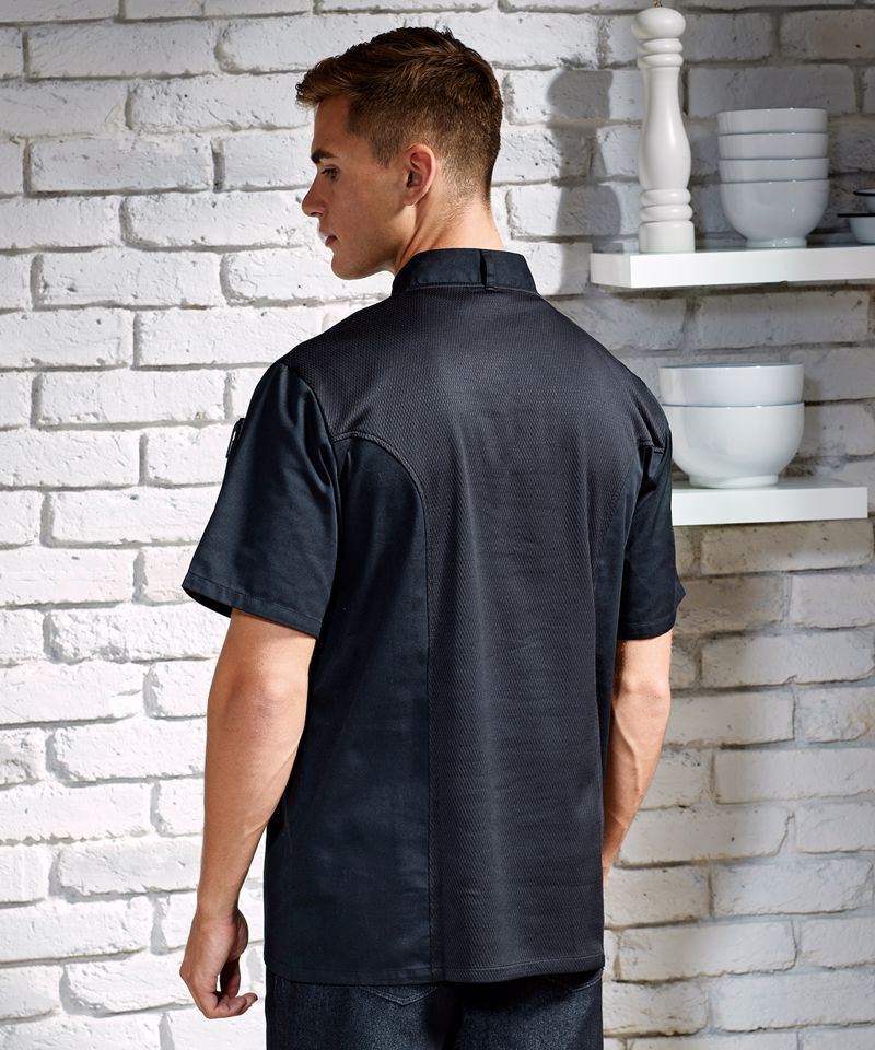 A short sleeve chef's jacket constructed with our very own Coolchecker® fabric. The centre back panel is made from the Coolchecker® fabric which offers exceptional moisture management and wicking properties so chef stays fresh and cool during service. A wrap over fastening with ten self-fabric buttons with a mandarin collar and a useful double pen pocket on the left arm.