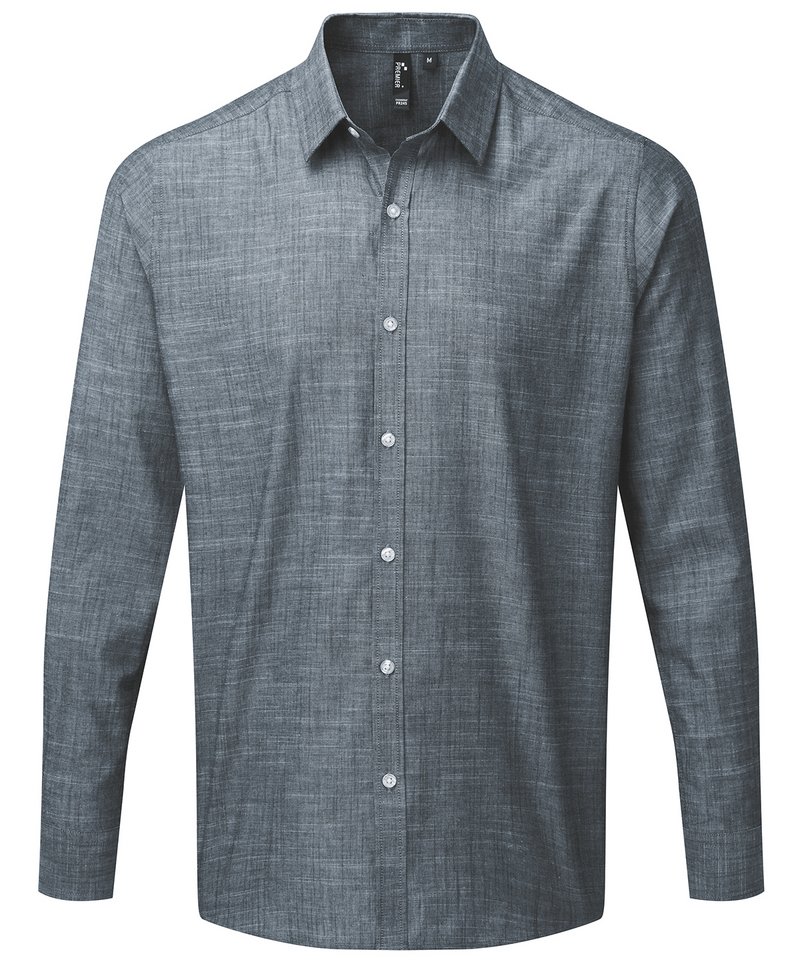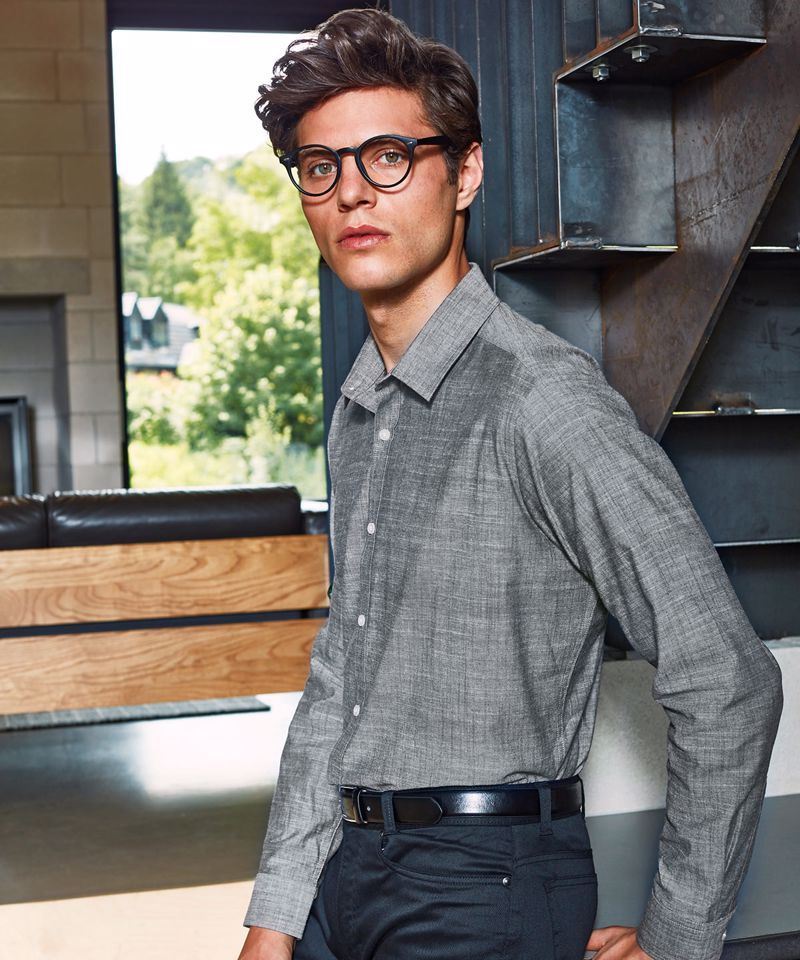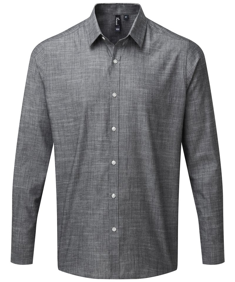 This semi-fitted men's shirt has an aesthetically pleasing texture which has been achieved by two contrast coloured yarns woven in an irregular pattern to create a slub effect. Long sleeves are fastened with a double button at the cuff with a sleeve guard facilitating a roll-back option on the arm. Soft collar styling with a top button fastening that leads to a six button placket.