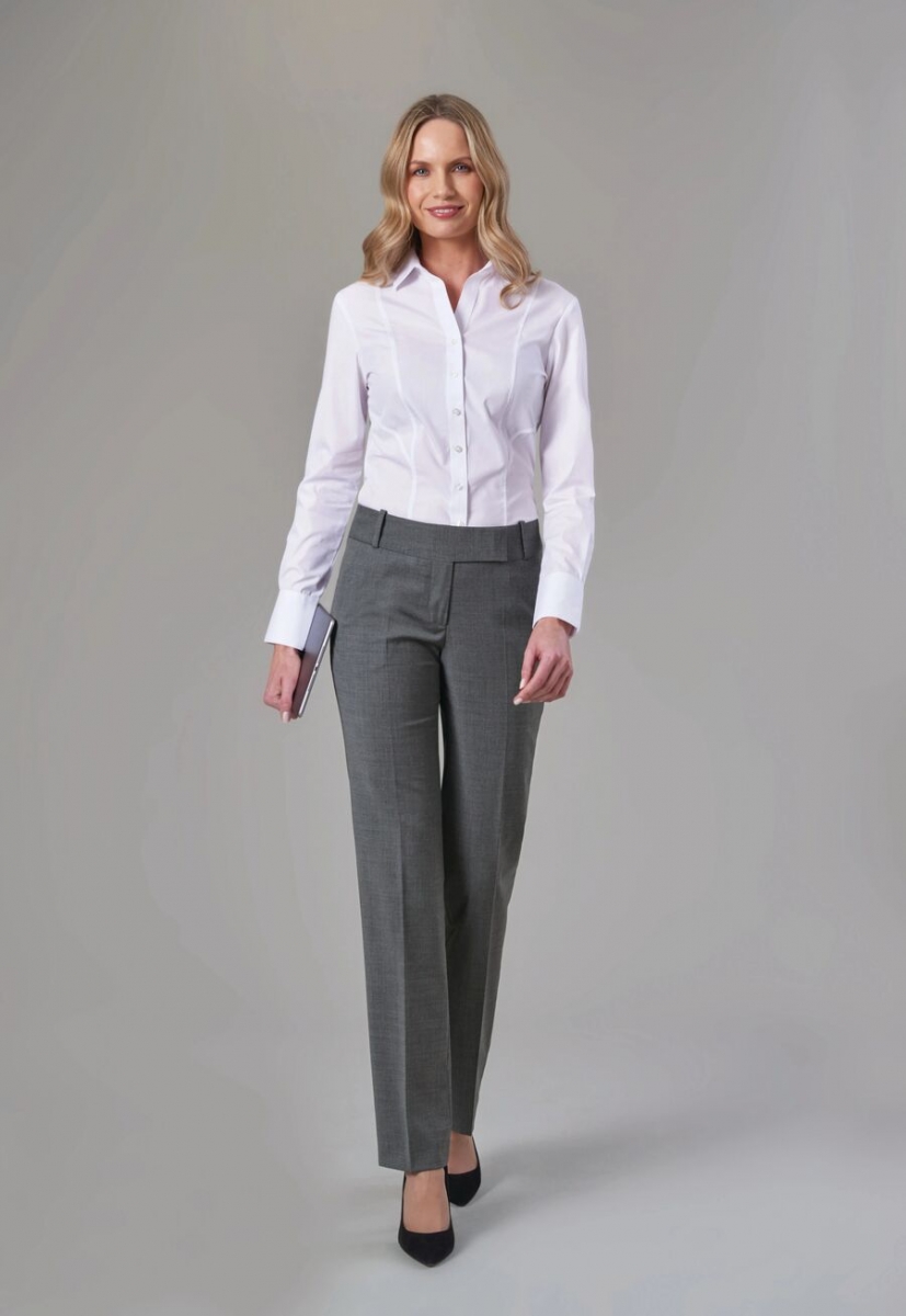 Tailored leg, front hook fastening, 2 side pockets, mock rear pockets, belt loops