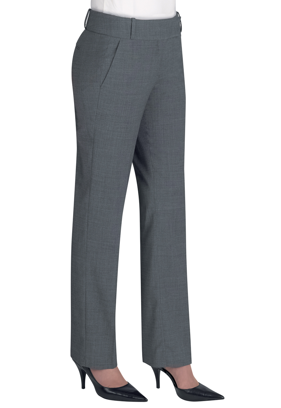 Slim leg, front hook fastening, 2 side pockets, mock rear pockets, belt loops