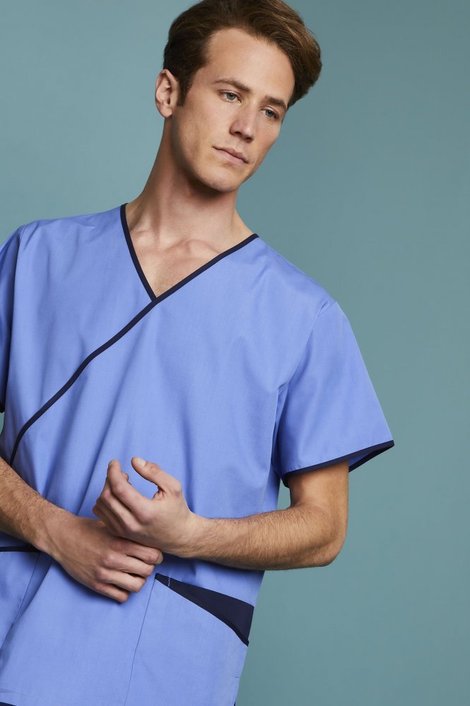 This Men's Fitted Metro Blue/Navy Scrub Top has a mock wrap style and features two patch pockets and side vents. Made from lightweight, quick drying and easy to care for fabric that requires minimal care & ironing. This scrub top meets all the requirements for a medical environment.