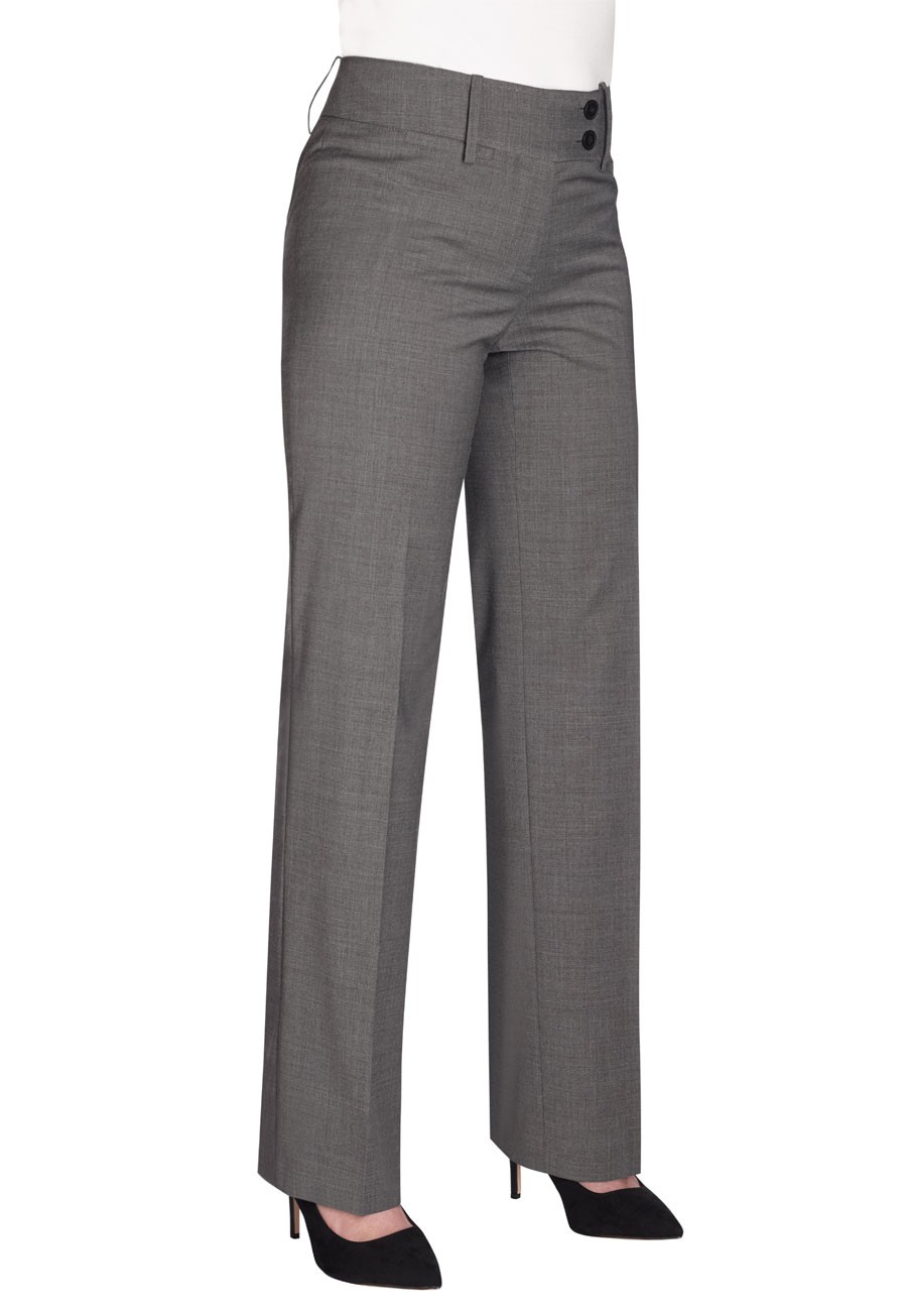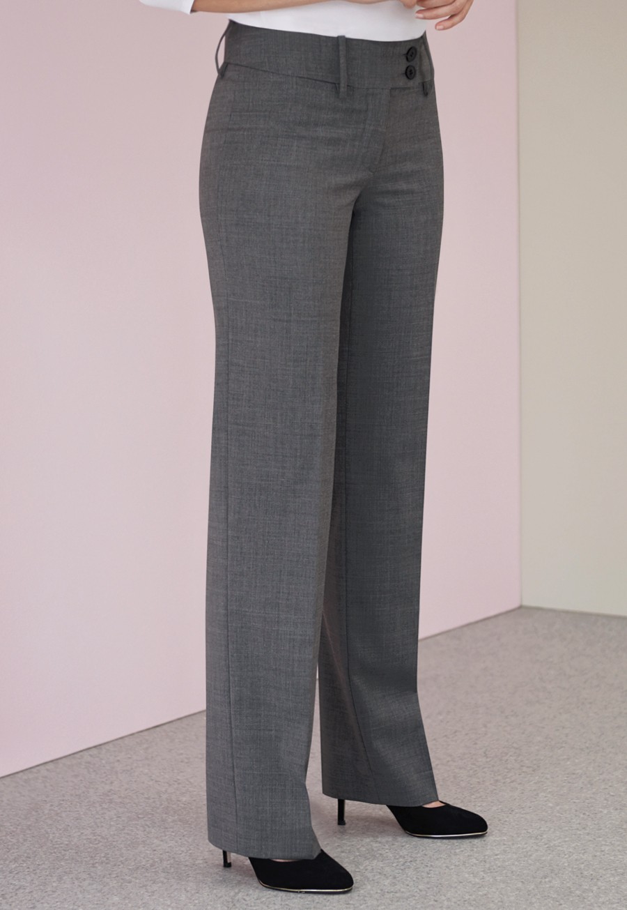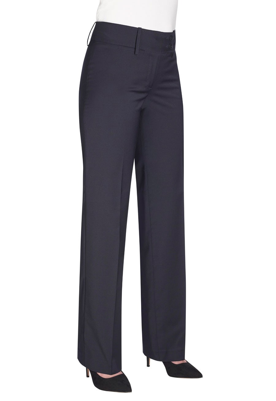 Parallel leg trouser, low waist, front double button fastening, key card pocket, mock rear pockets Half hem width at size 12 = 23cm Machine Washable and Dry Clean