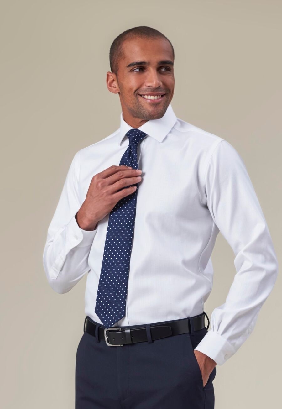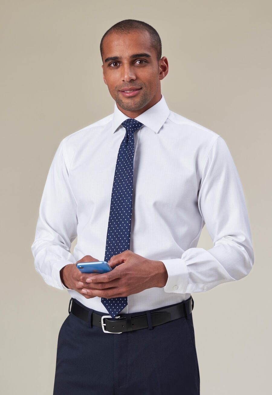 Complementary silk cuff knots, taped seams, removable metal collar stiffeners