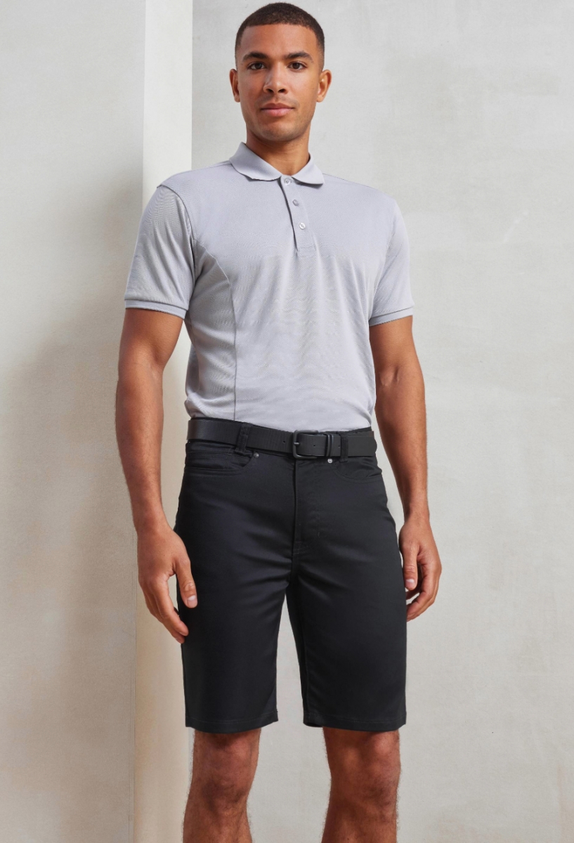 Based on the popular chino jeans, these mens chino shorts are styled with a covered zip fly fastening and button to the waistband. There are loops on the waistband to facilitate a belt, two side pockets with rivet detail and two patch pockets to the reverse. Finished with a double turned hem, they are a great option for the warmer months and offer a more casual and playful approach to corporate dressing. A touch of elastane through the fabric provides an element of stretch for maximum comfort.