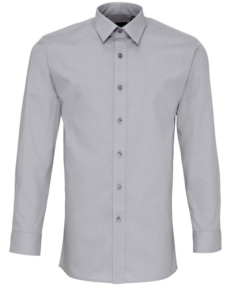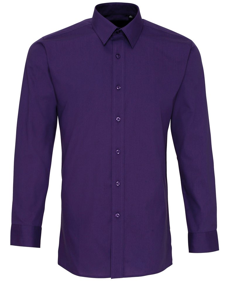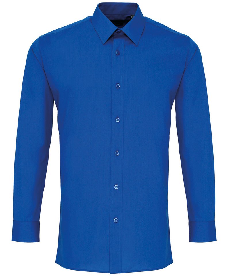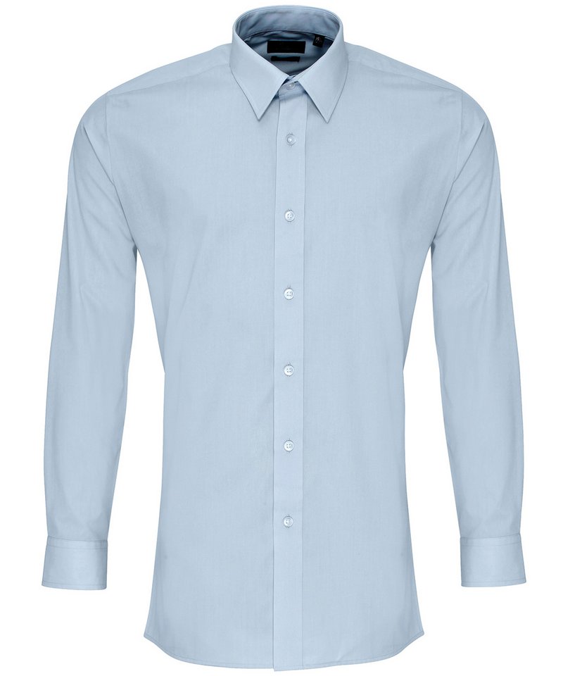 A men's fitted long sleeved Poplin shirt that offer a fashionable slim fit style for today's modern workplace. This shirt comes with an optional chest pocket for attachment if required. A stiff formal cut collar with double buttons to the cuff. Available in the best-selling colours from the Premier 'Colours Collection.'