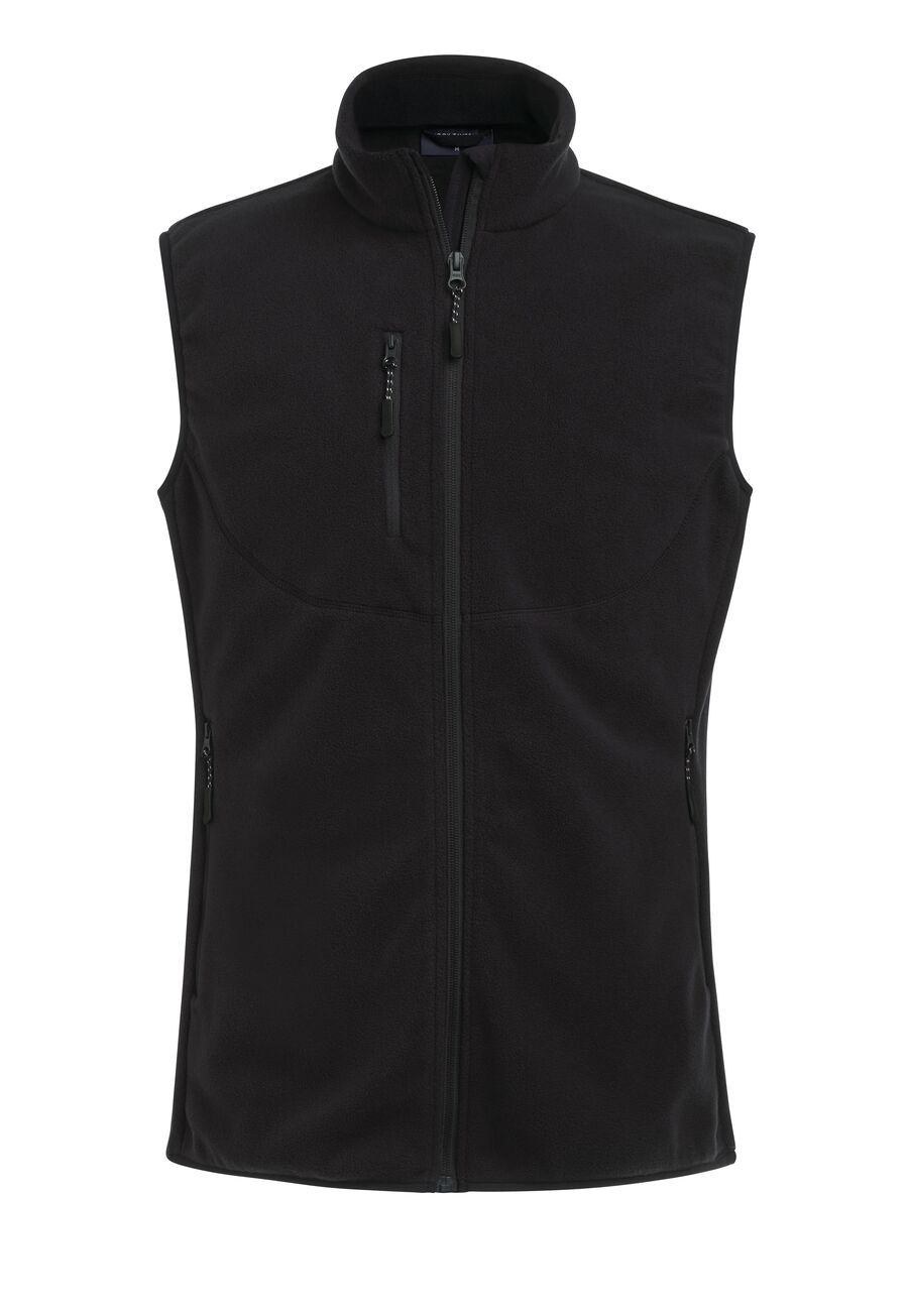 Full zip fleece gilet, chest zip pocket, 2 side zip pockets, soft elastic binding at hem, 4 tonal zip pullers.