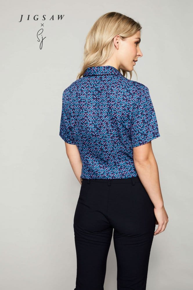 Short Sleeve Open Collar Blouse, Navy Micro Petal