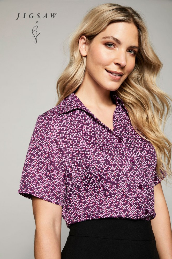 Short Sleeve Open Collar Blouse, Plum Micro Petal