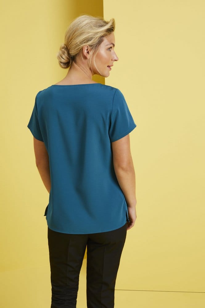 Short Sleeve Pleat Neck Blouse, Dark Teal