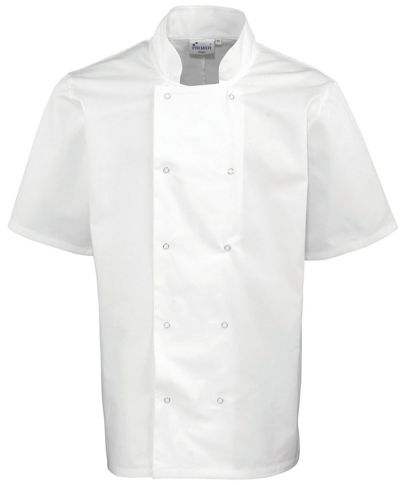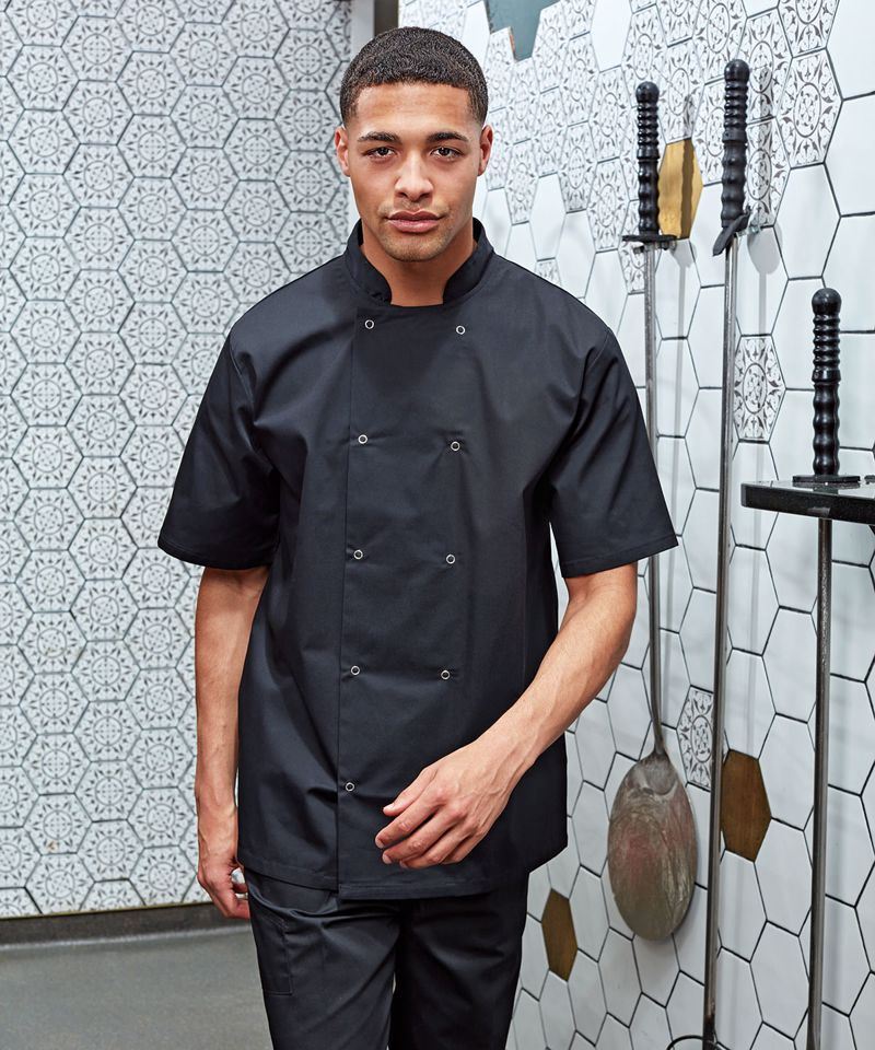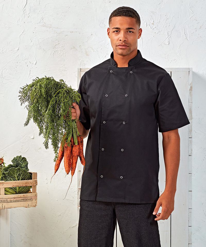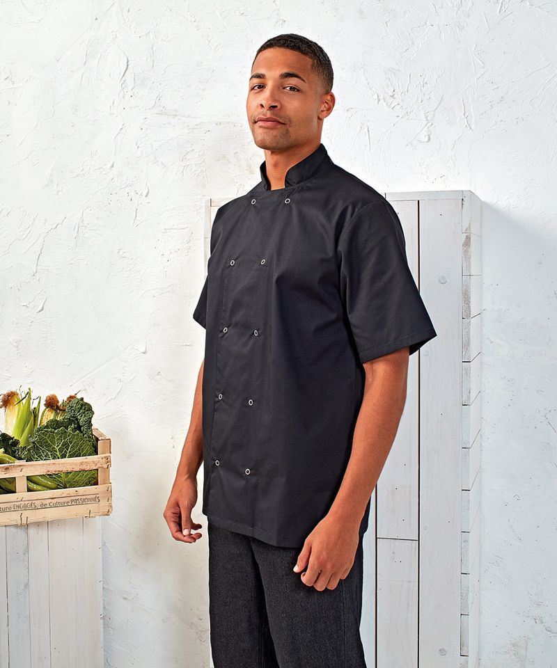 An easy-wearing short sleeve chef jacket with ten metal press studs in a popular wrap over style. Features a Mandarin Collar with topstitching and is available in Black or White.