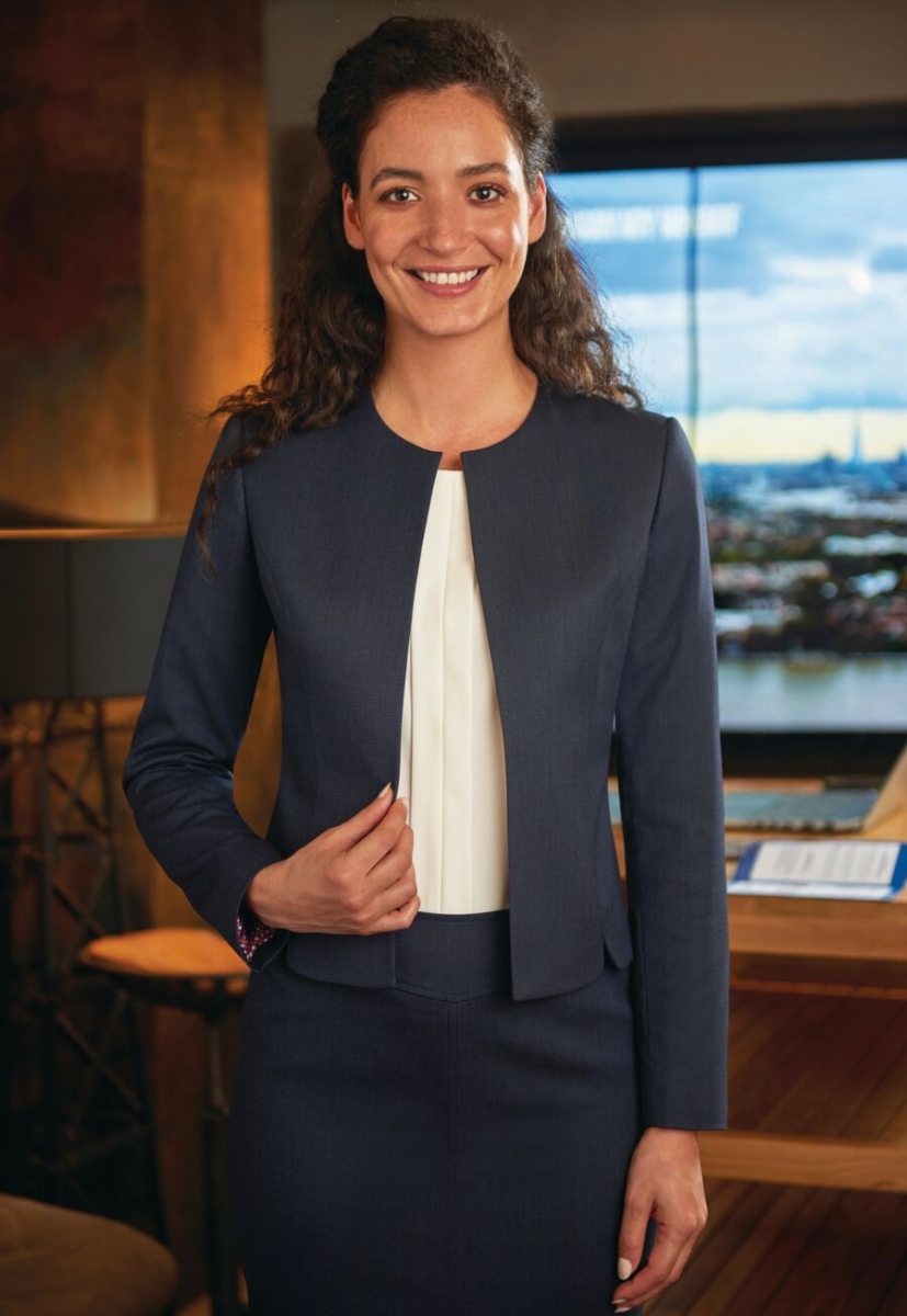 Tailored fit, colarless styling with curved splits, 2 internal jett pockets, curved front/back seams