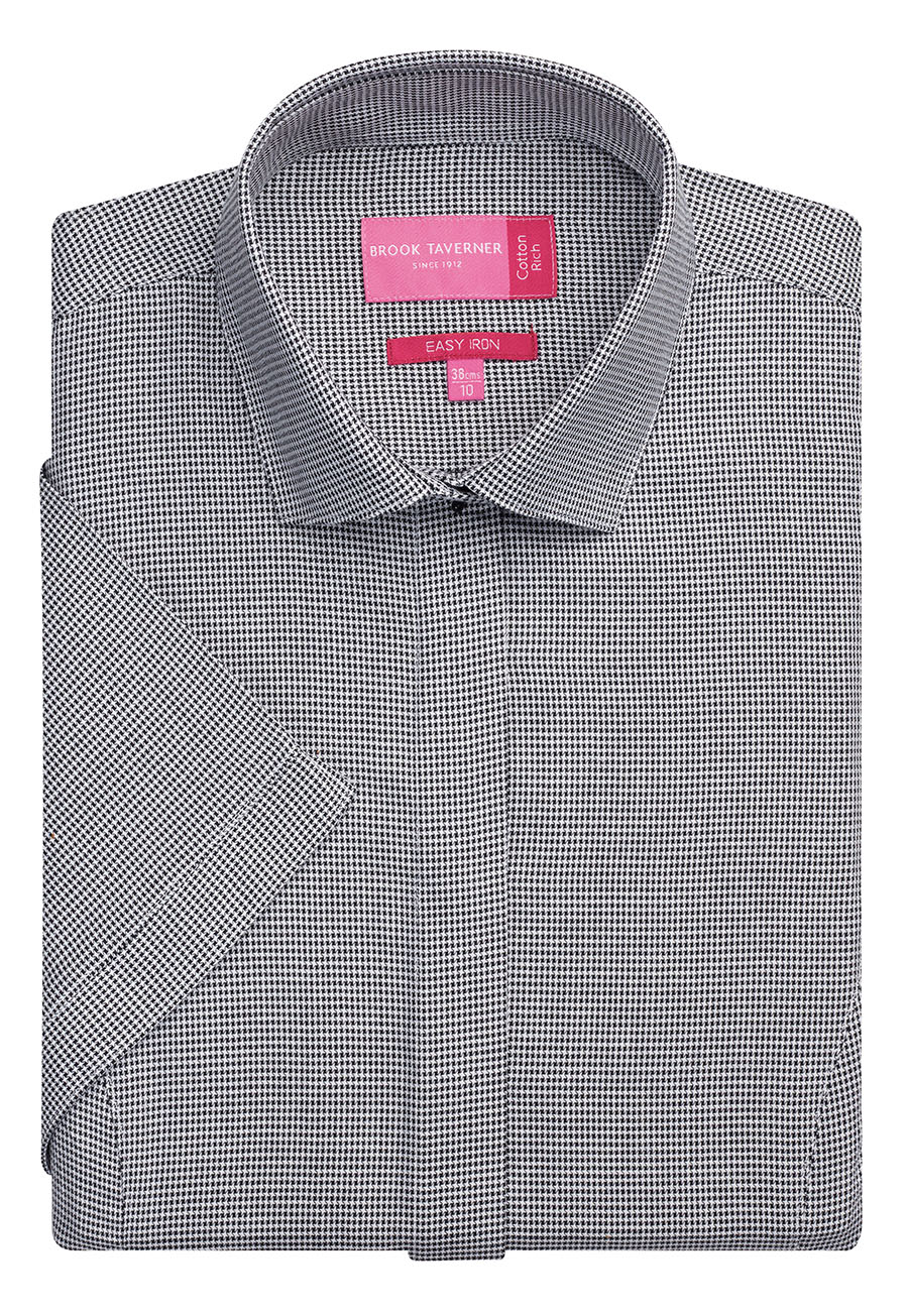 Cotton rich, semi-fitted, short sleeve ladies blouse, Fly front, Button up collar, cutaway collar
