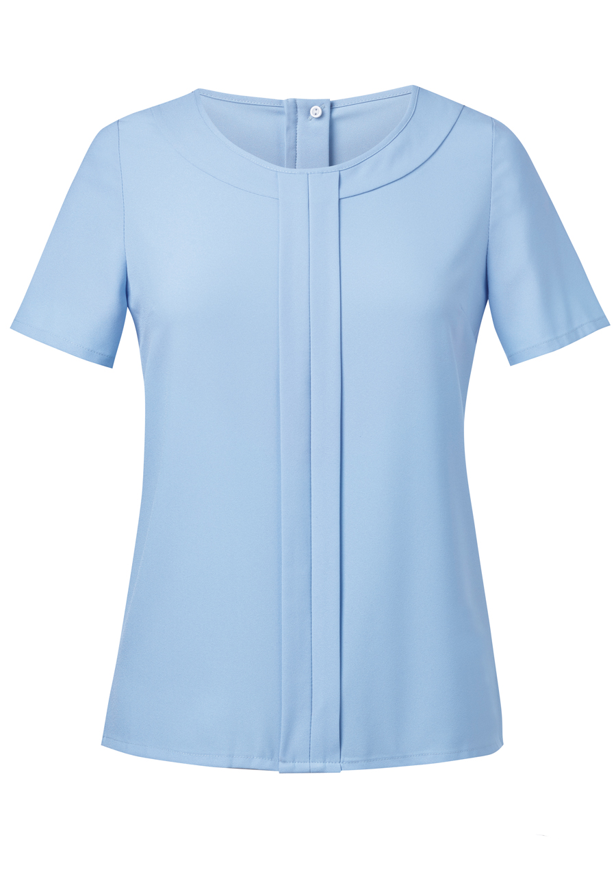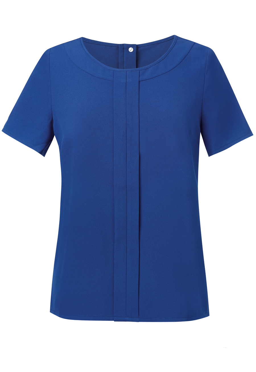 Short sleeve ladies' blouse, round neck, front pleat detail, bust darts, rear gold zip detail, easy care - machine washable at 30 degrees Machine Washable