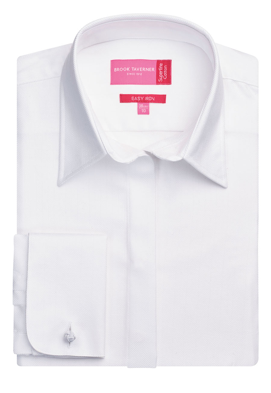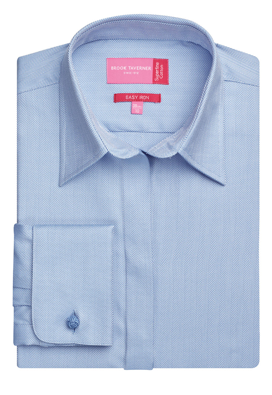 Tailored from a 100% superfine cotton, easy to iron fabric. Semi-fitted. Complimentary silk cuff knots. Matching short sleeve Ozzero blouse available in white herringbone and blue herringbone. Matches men's Andora shirt. Machine Washable