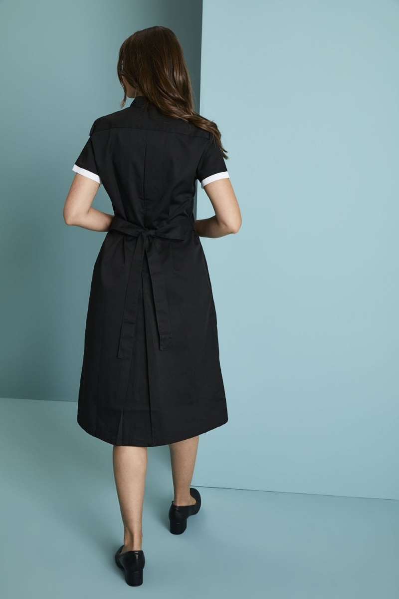 Cette robe de ménage est conçue pour être confortable et facile à utiliser. Une robe noire simple et féminine qui présente une bordure blanche contrastante aux poignets et au col. Conçue pour être semi-équipée du style des panneaux de princesse, la robe offre une grande facilité de mouvement, tout en respectant les exigences du travail, tout en créant une coupe flatteuse qui rend votre personnel et votre équipe plus attrayants et complémentaires à votre entreprise. Pourquoi ne pas ajouter le nom ou le logo de votre entreprise en utilisant notre service de broderie pour que votre marque se démarque de la foule.