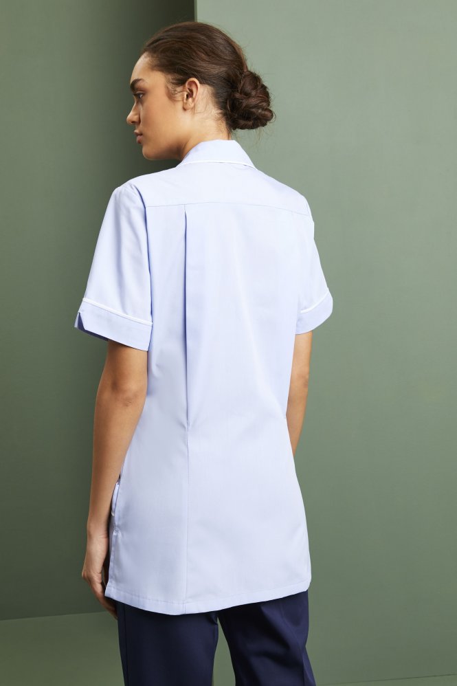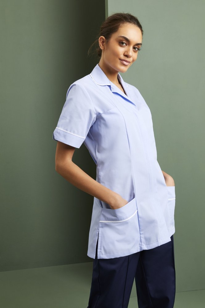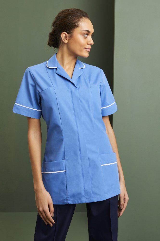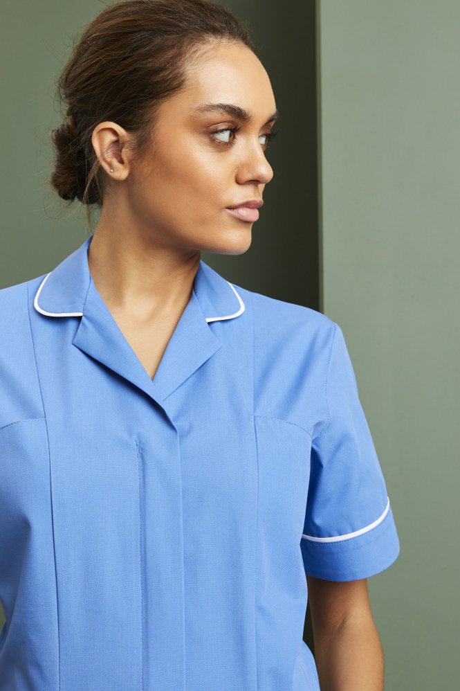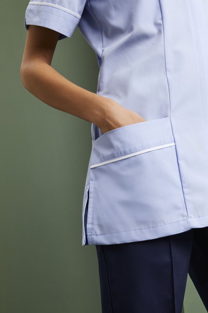 Fabriquée à partir d'un tissu léger en polyester et coton mélangés, notre tunique de soins de santé à col classique léger en bleu hospitalier est parfaite pour un environnement médical. Gardez de petits objets et des outils à portée de main tout au long de votre quart de travail dans les deux poches intérieures et la poche poitrine étanche. Conforme au contrôle des infections, ce haut est conçu pour un environnement médical, laver à 60 ° C et repasser si nécessaire.