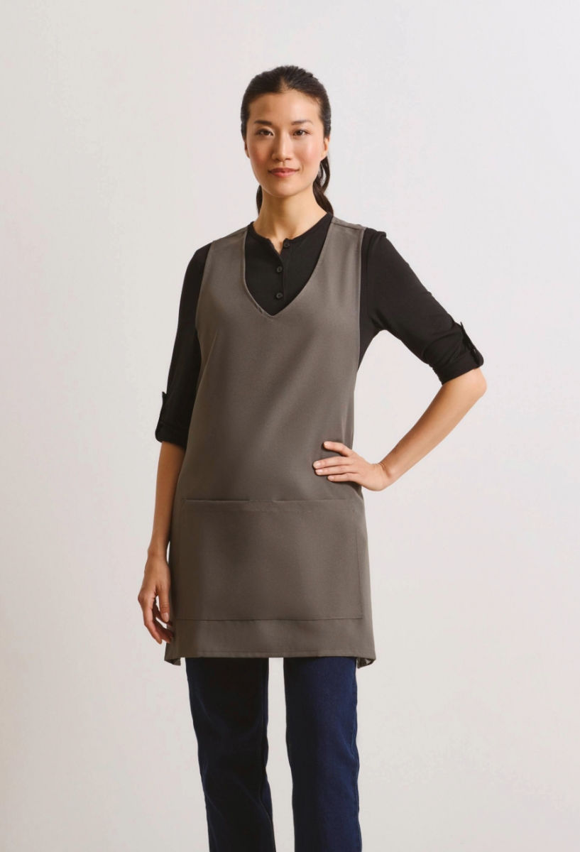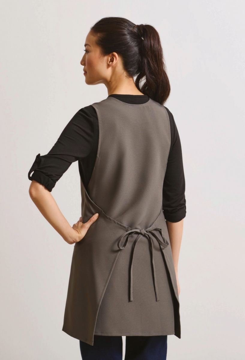 Une tunique portefeuille très élégante et attrayante, offrant aux entreprises une alternative aux tabliers et tuniques traditionnels. Ce modèle à enfiler se ferme de l'arrière vers l'avant par le dessous, puis se replie sur lui-même et se noue discrètement dans le dos. Sa coupe flatteuse met en valeur la silhouette féminine et présente un col en V et des fentes latérales pour une liberté de mouvement optimale.