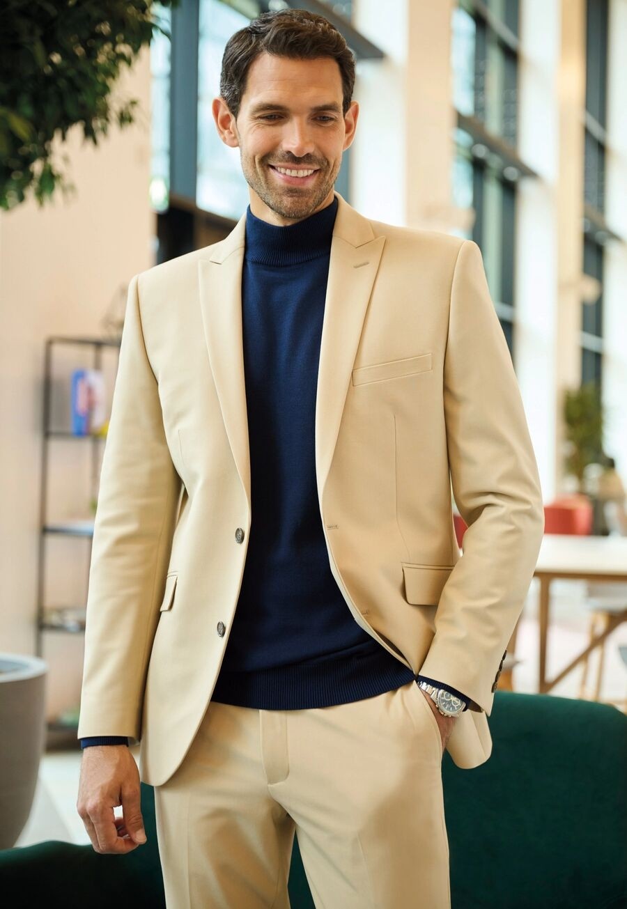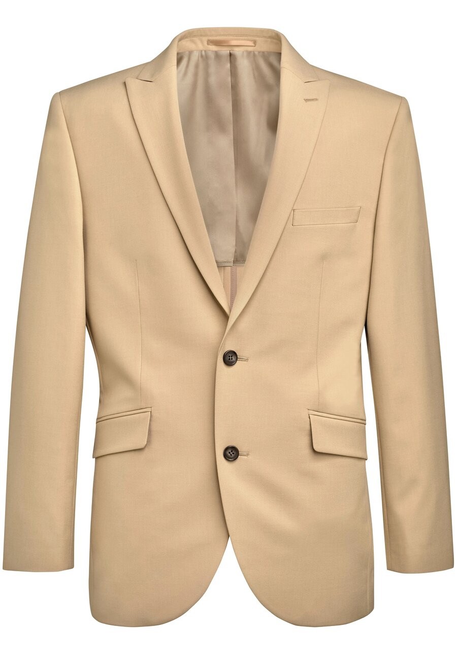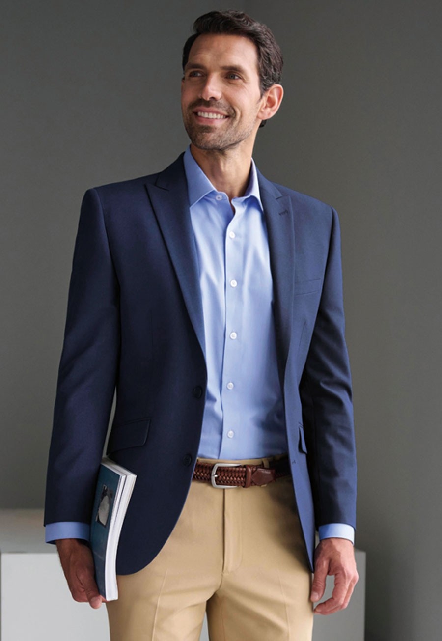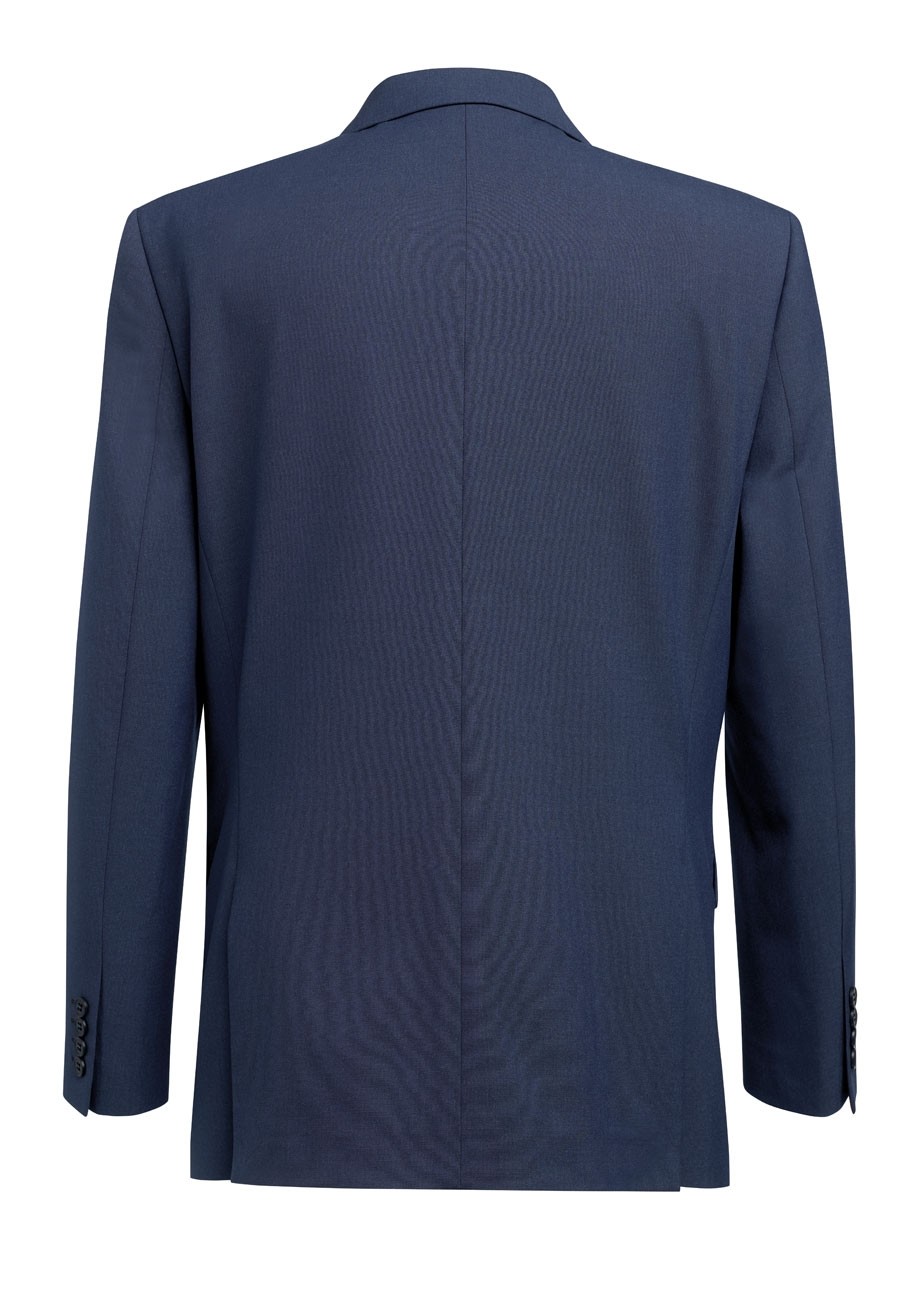 Coupe ajustée, 2 boutons, revers en pointe avec fentes latérales, 2 poches à rabat en biais, 2 poches passepoilées internes, doublure buggy. Longueur milieu dos en taille 40R = 76 cm