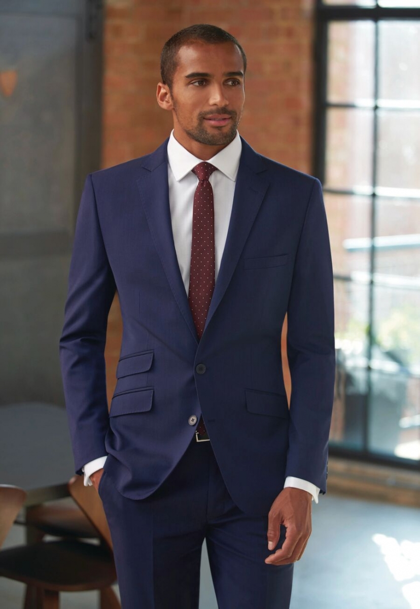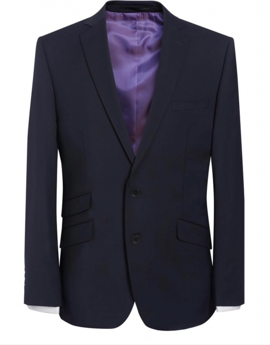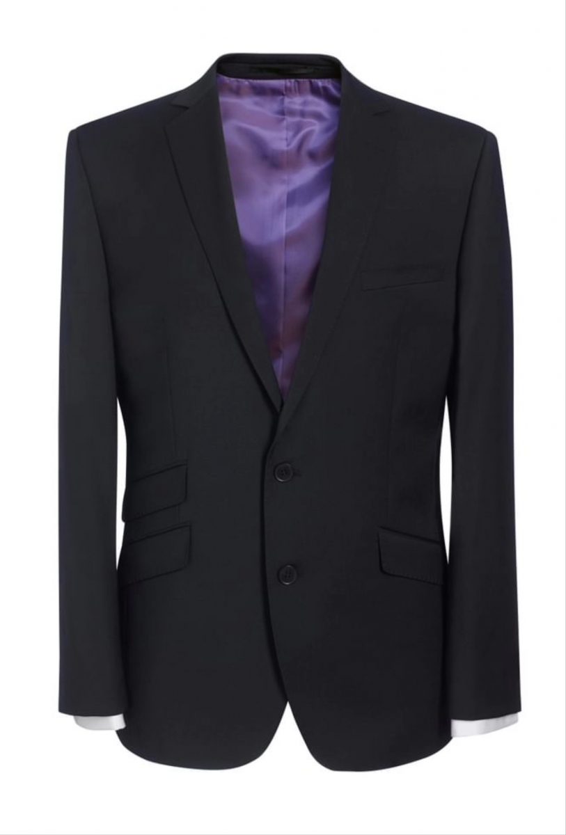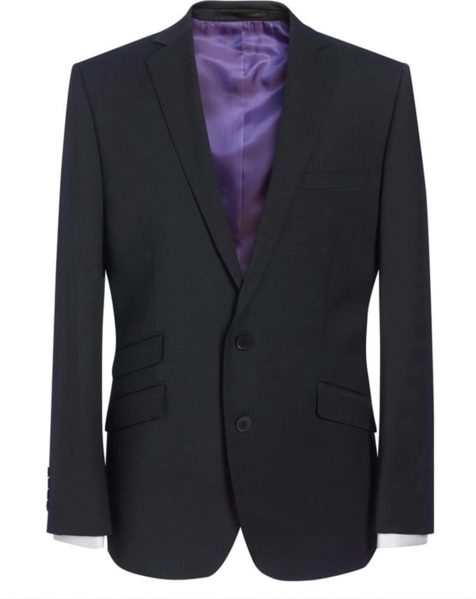 Simple boutonnage Coupe ajustée jacket, shorter length, devant à 2 boutons, fentes sur les côtés, ticket pocket, slim lapels avec saddle stitching, piano faced interior avec slim pocket jets.