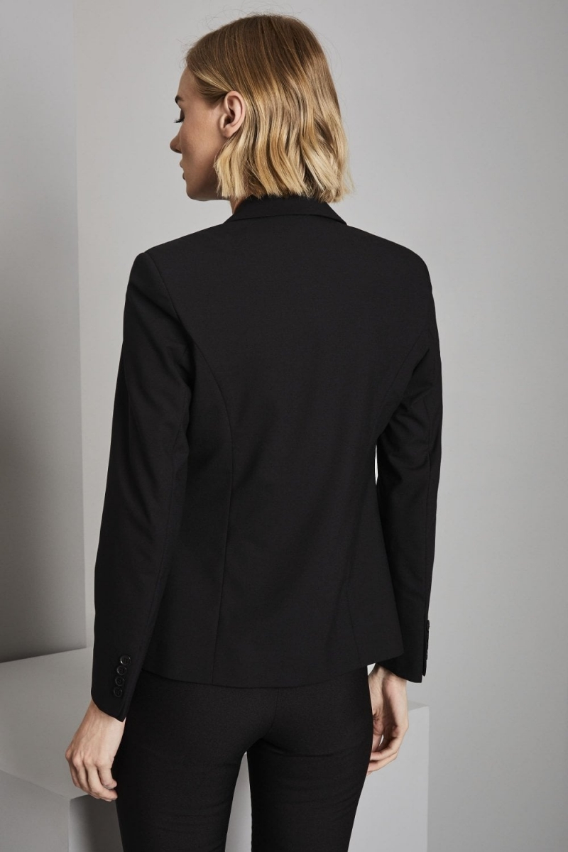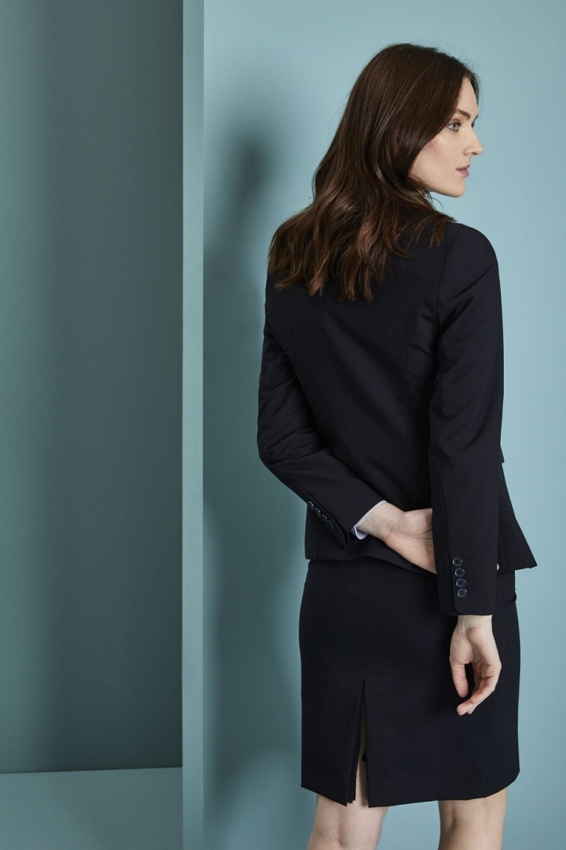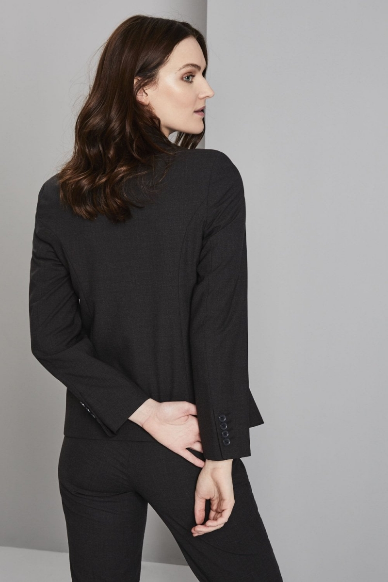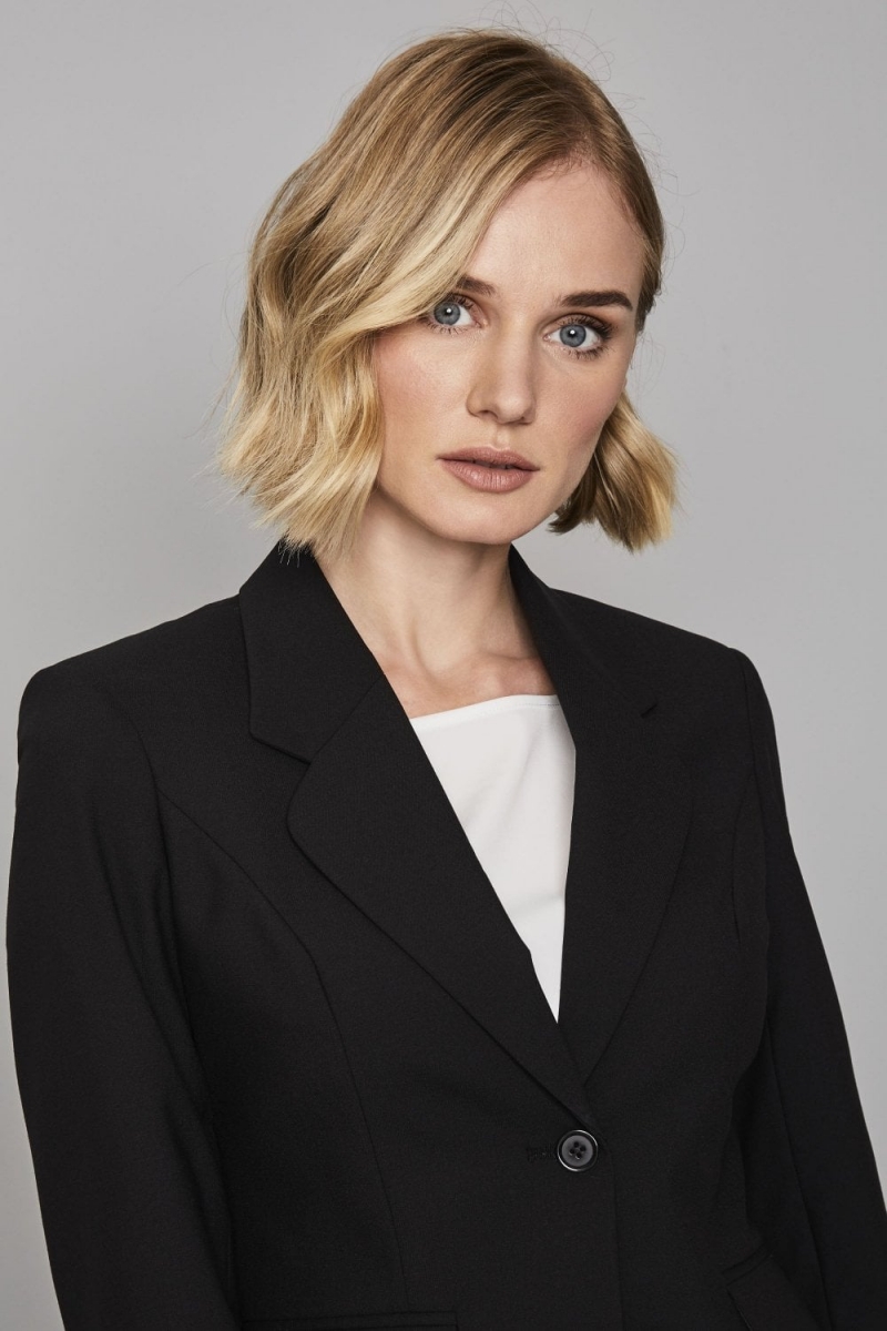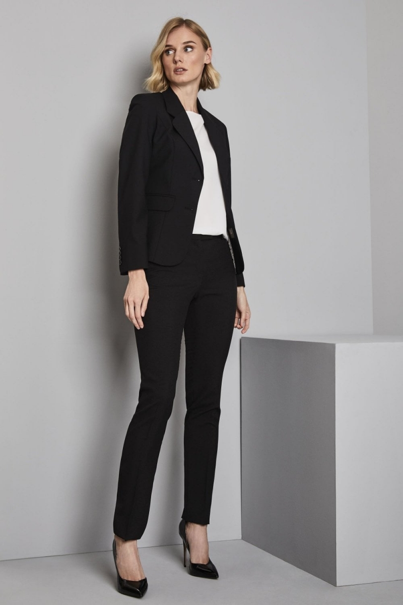 La silhouette près du corps, le blazer à deux boutons offre un style plus ajusté avec une apparence contemporaine et moderne. Idéal pour les travaux qui nécessitent de nombreuses assises pour éviter les froissements. Blazer ajusté noir à deux boutons et à boutonnière avec revers plus courbes, poche asymétrique fonctionnelle à jets avec rabats et poignets incurvés pour une silhouette en sablier.